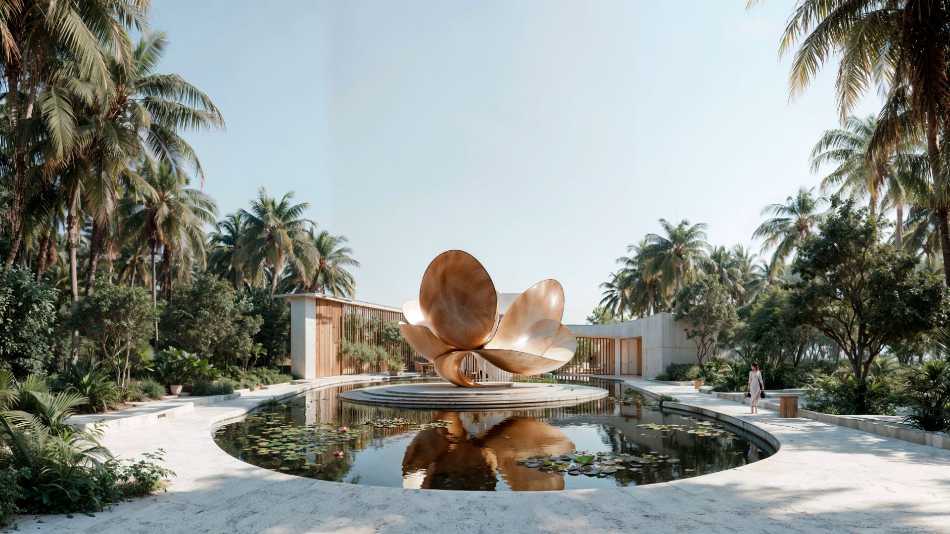 A stretch of white sand caressed by the crystal-clear waters of a lagoon, surrounded by palm trees and subtropical vegetation.