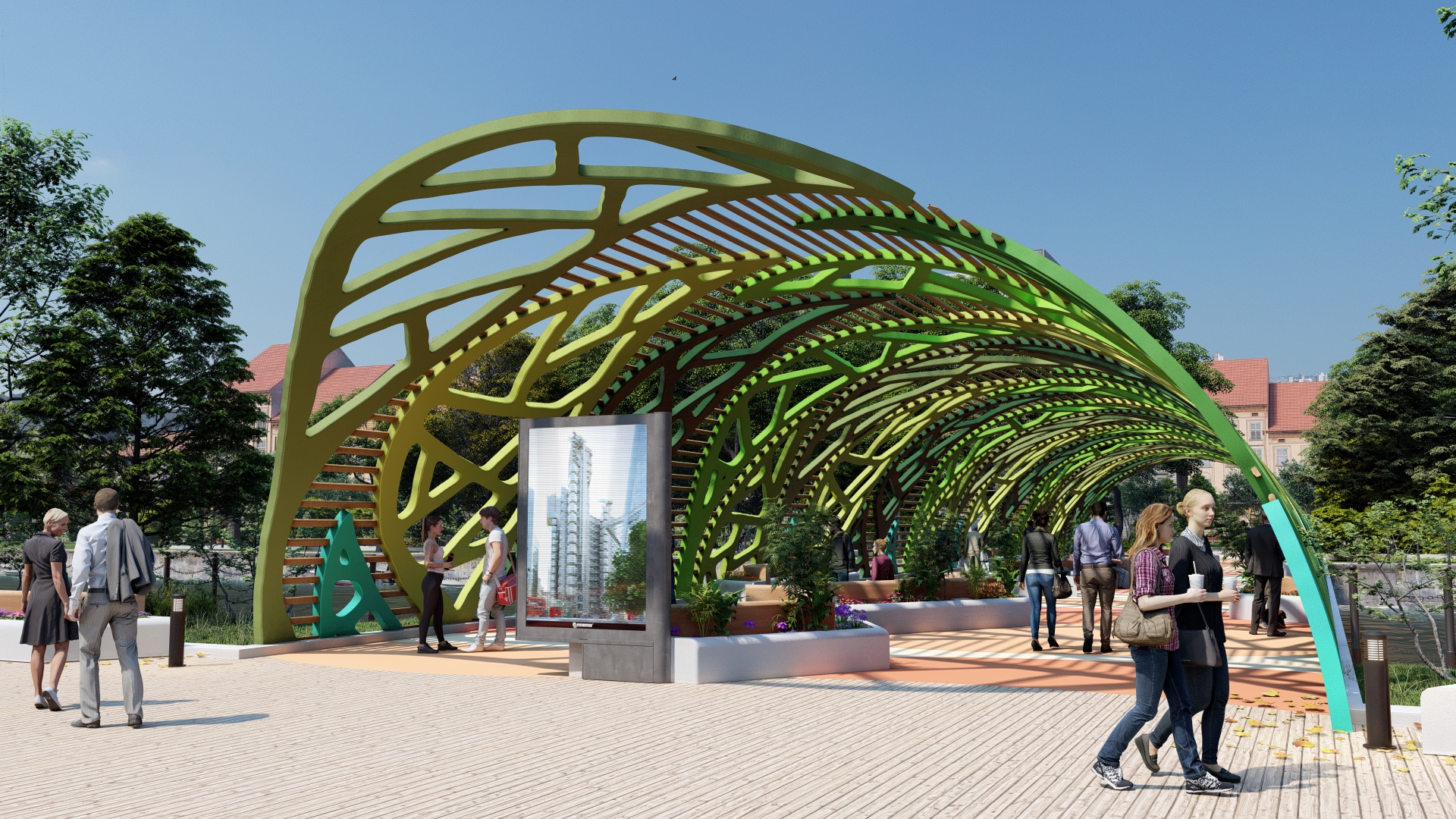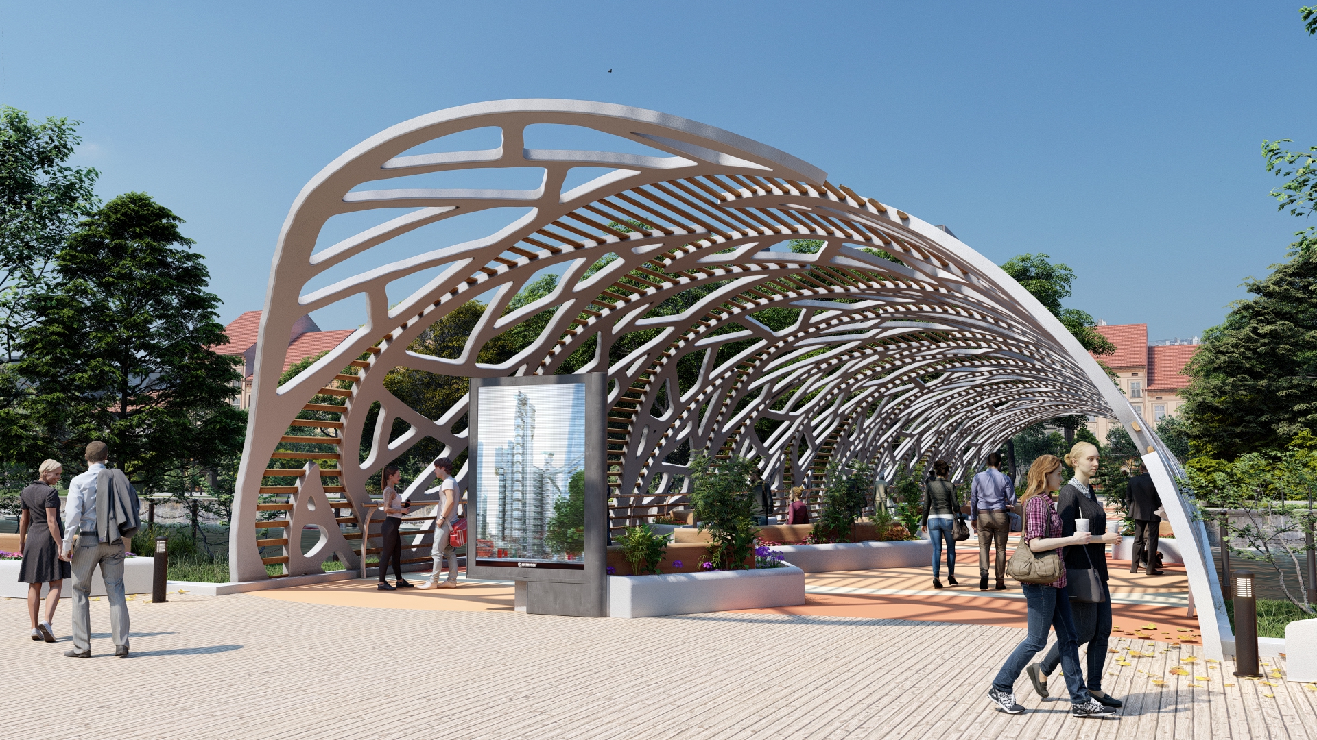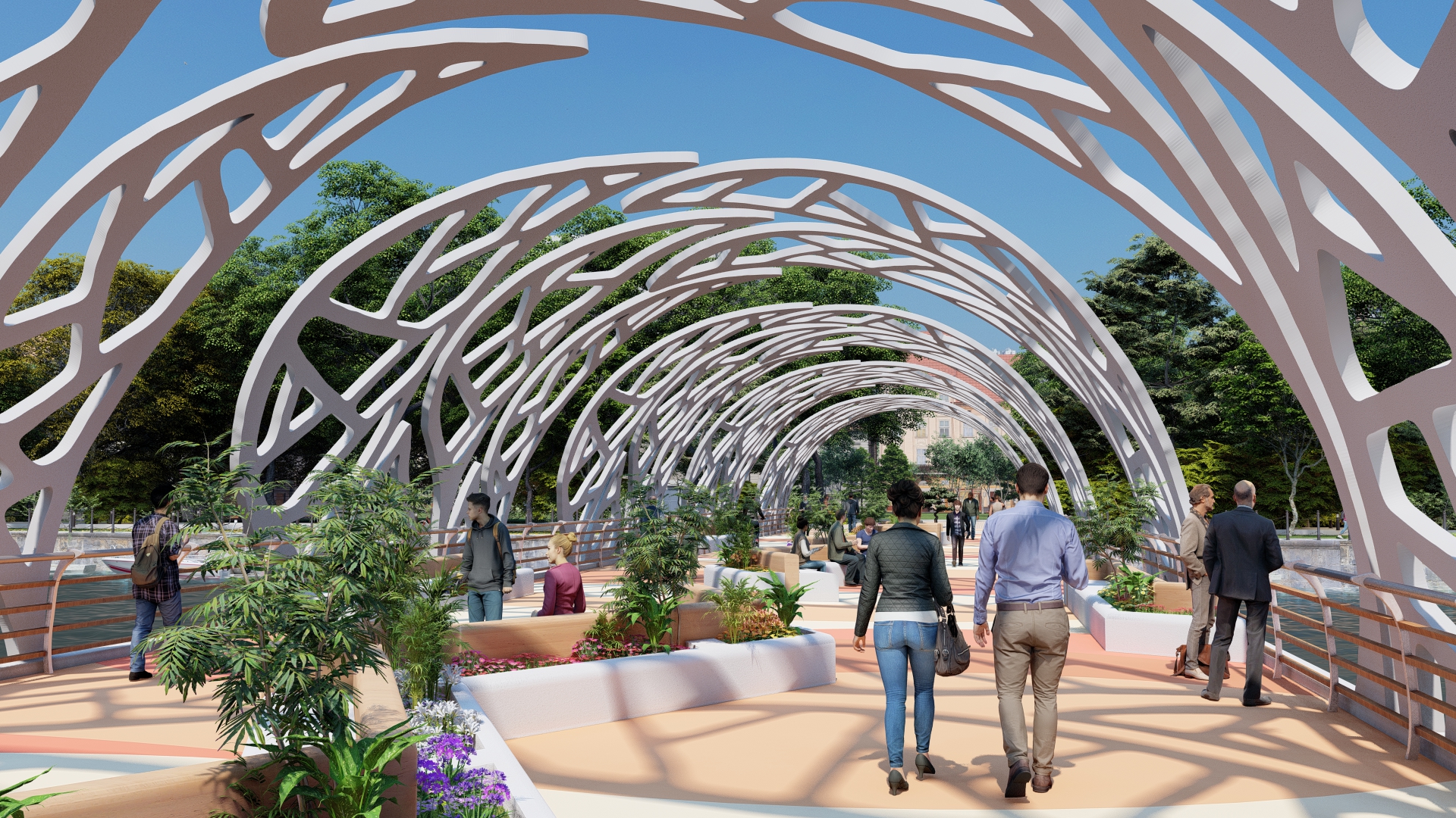 In the style that characterises many of the designs we produce at Amusement Logic, we have created a cover over the bridge, under which pedestrians can enjoy taking a stroll or taking a quick break in its shade.