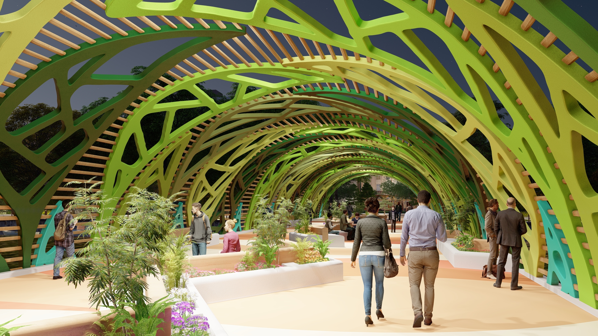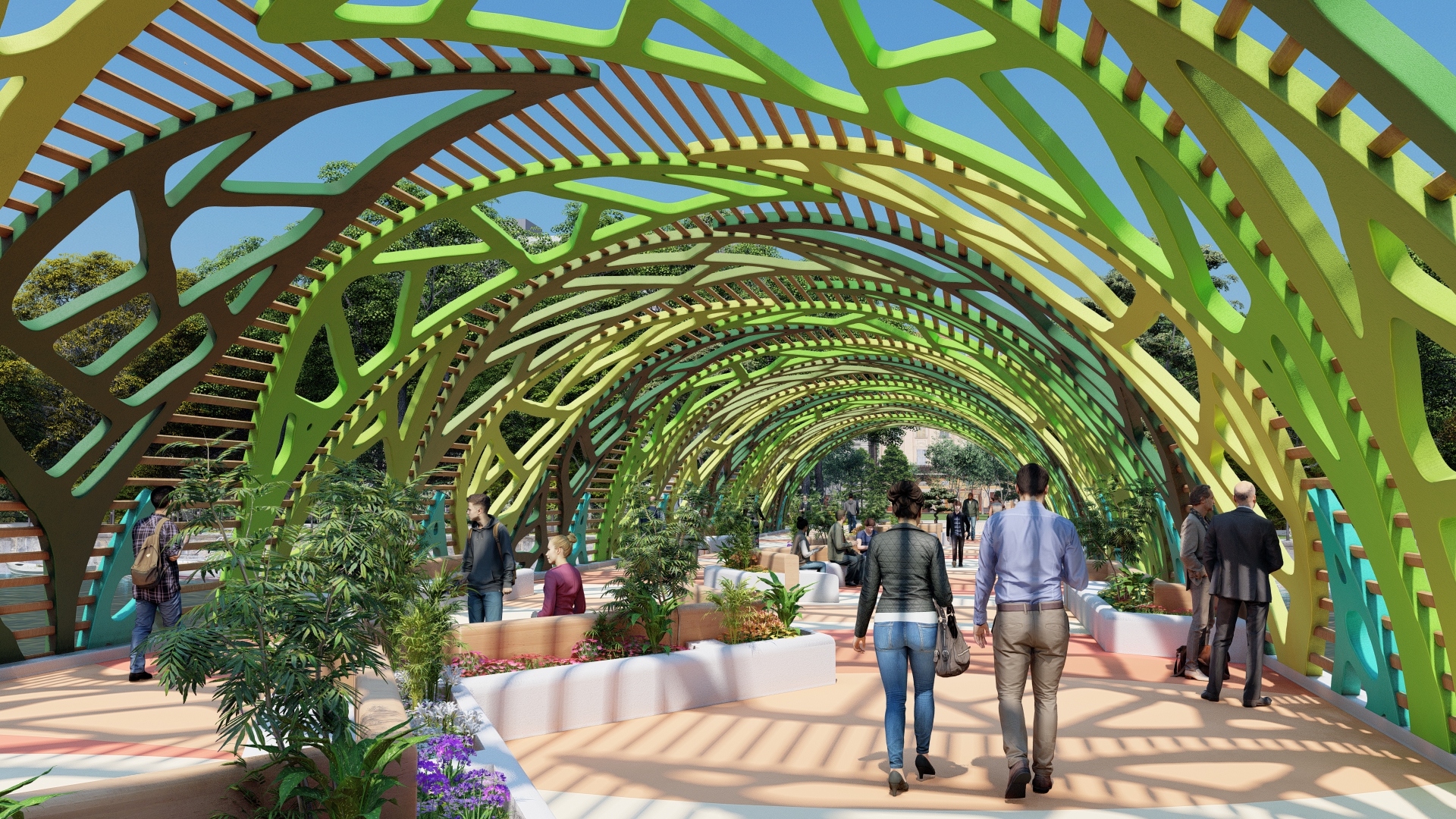 With the design of an organic pattern, the appearance of the bridge becomes pleasant, almost inviting to be crossed, it becomes a new experience. Furthermore, the colours we have selected offer a warm, natural and enveloping vision. The shadows and patterns cast by the organic pattern make the bridge more attractive and provide protection on hot days.