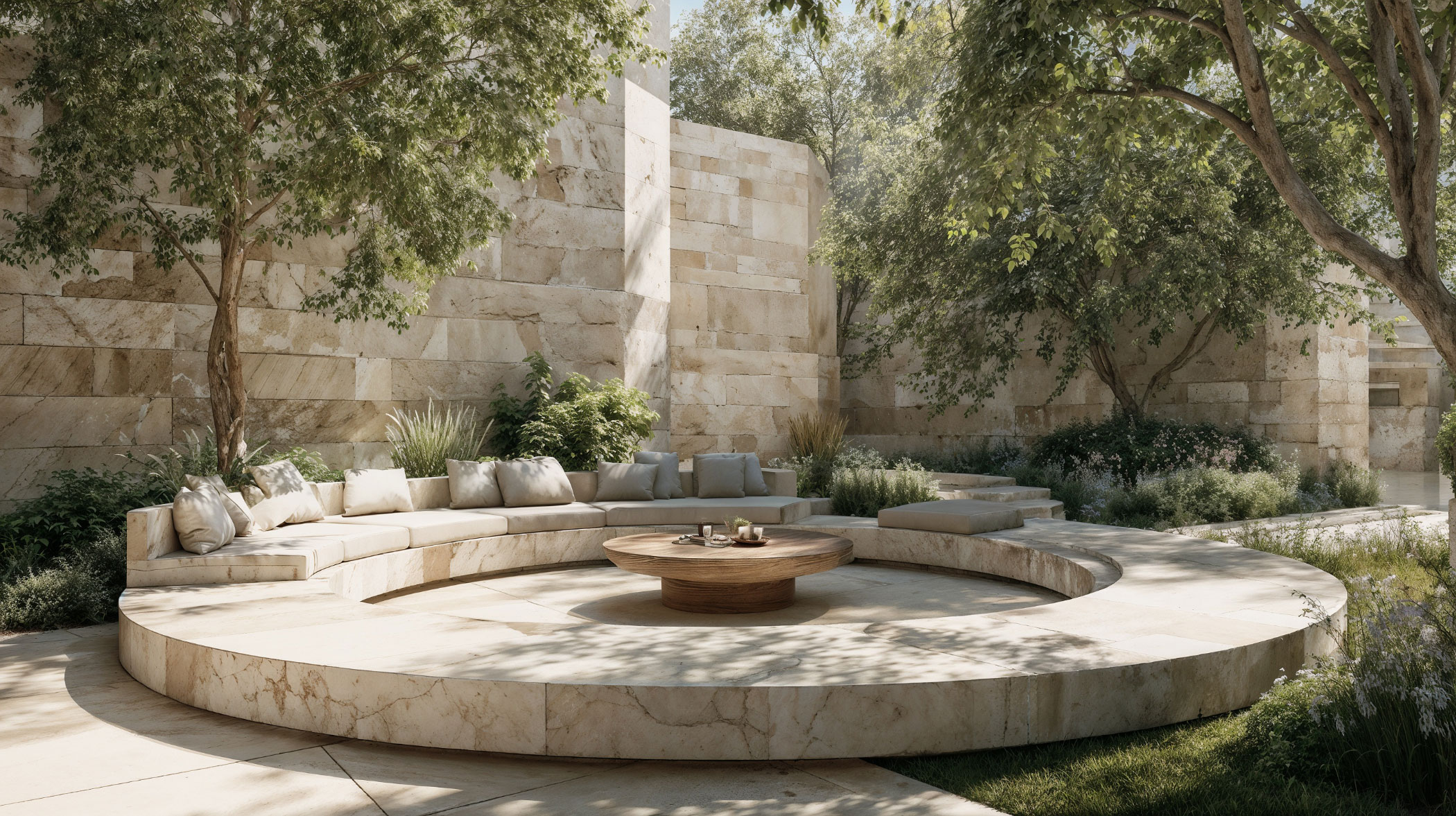 These are settings for life and dialogue where elegance emanates from simplicity. Technique is placed at the service of almost superhuman qualities. Stone and design are supported by an unusual balance.