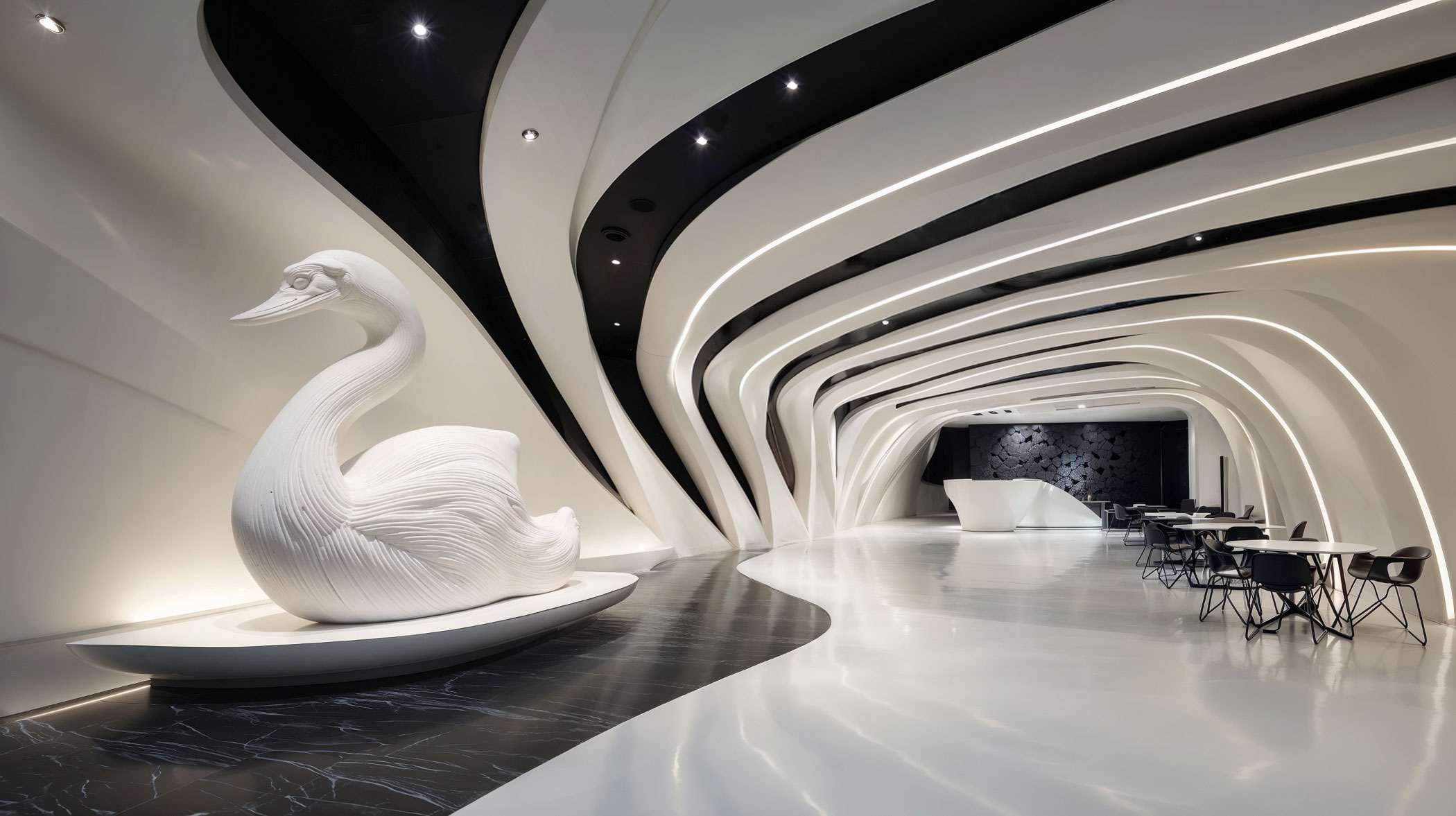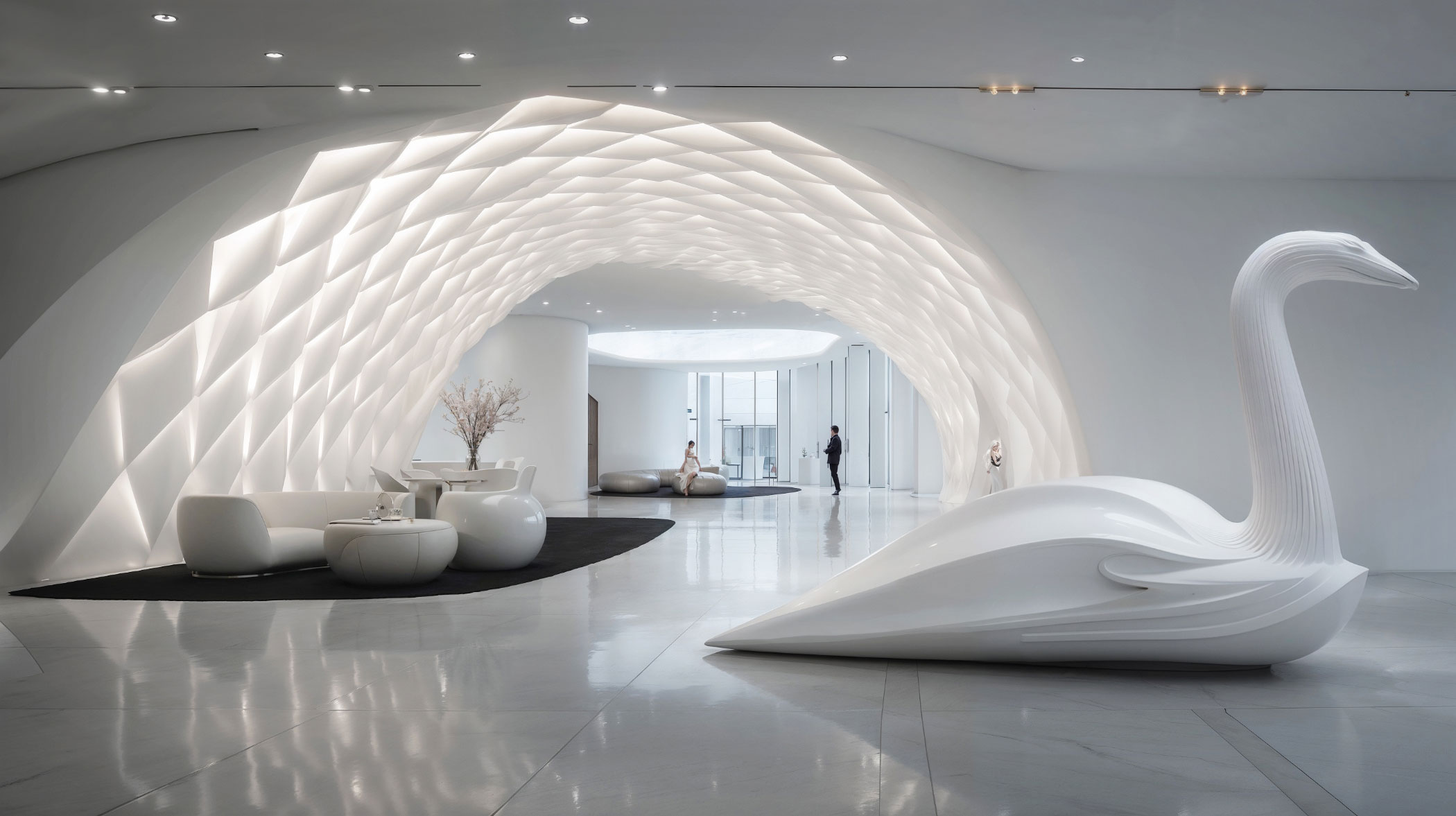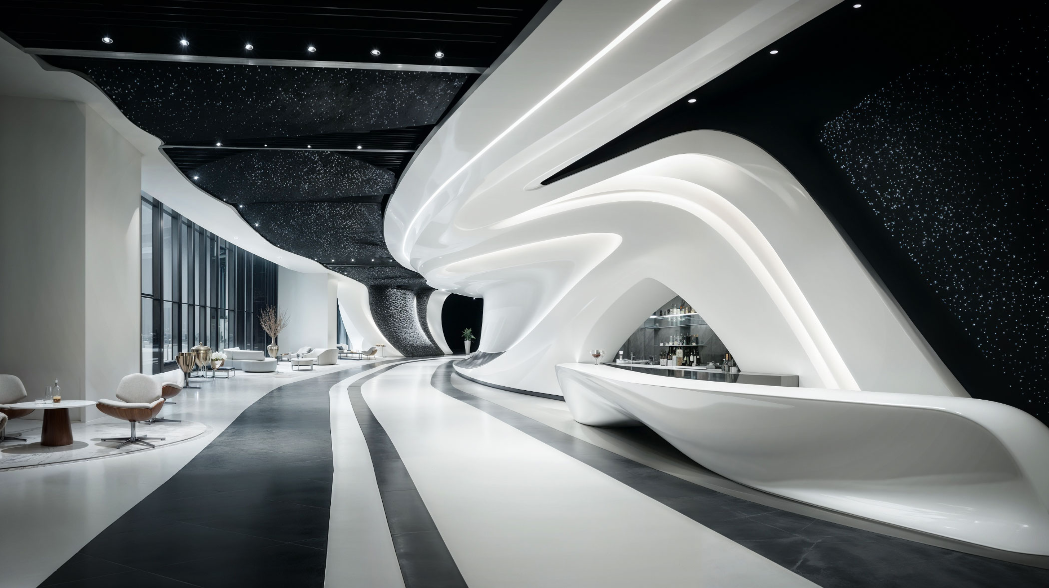 The undulating structures that dominate the ceilings form sculptures touched by light that modulates the atmosphere and intuitively guides visitors through the spaces. The materials—lacquered and polished, tactile—reinforce that feeling of almost celestial purity and, of course, modernity. After all, these spaces beat as the heart of hotels, residences, or iconic shopping centres; the idea is to offer a sensory experience rather than a commercial one.