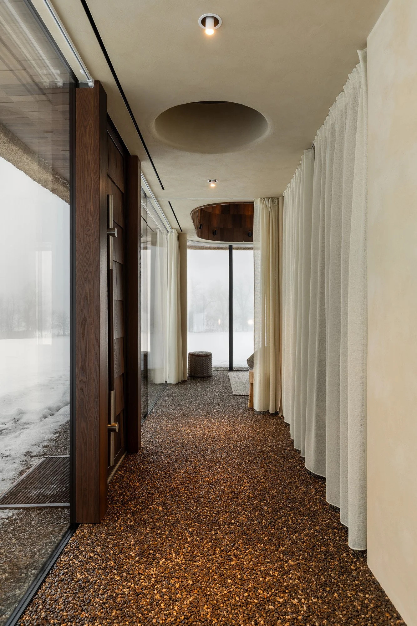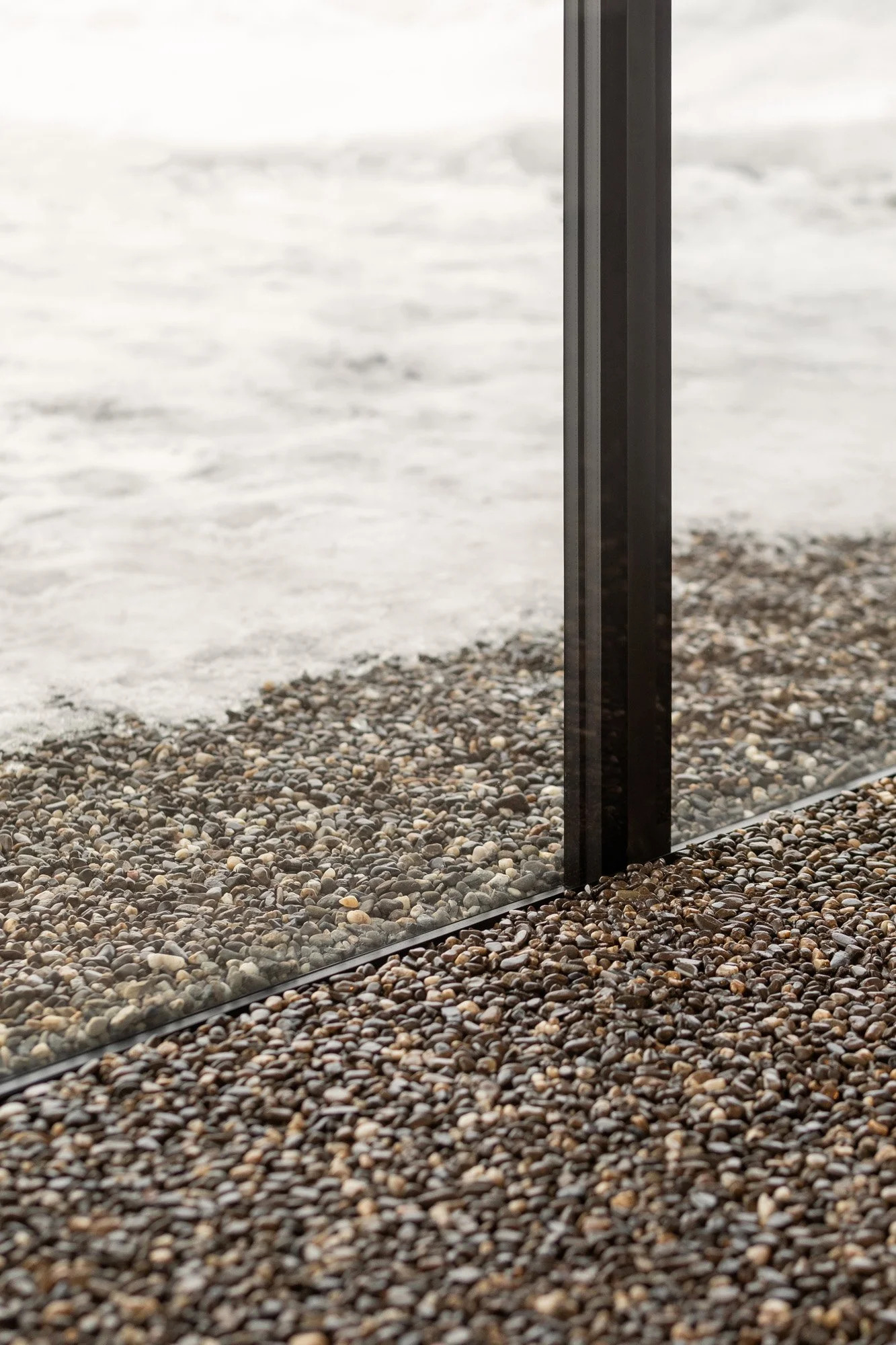 During the day, the roof appears to float above the landscape, as if suspended, resting on glass façades that almost disappear. The floor, finished with a continuous layer of bonded aggregate — identical inside and around the exterior perimeter — reinforces spatial continuity. When privacy is desired, automated curtains enclose the space.