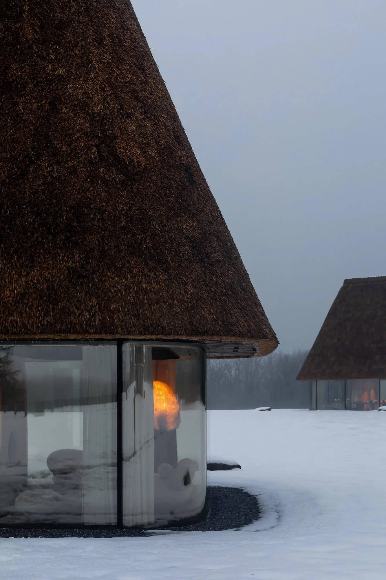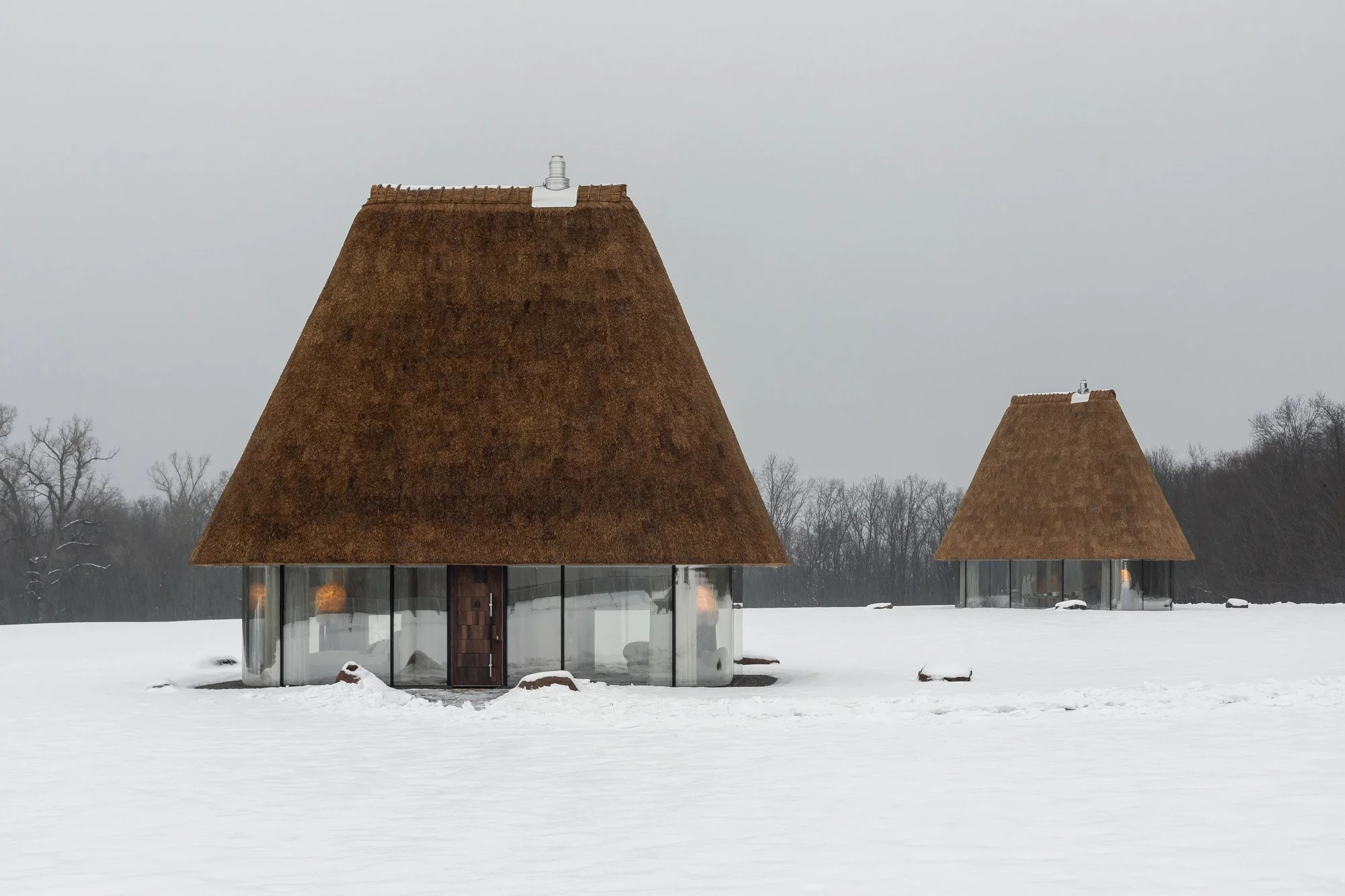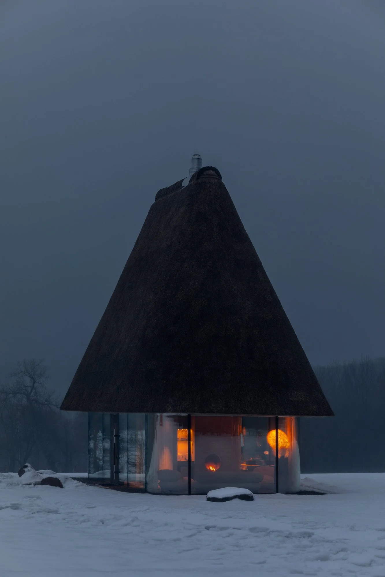 In a rural area of central Ukraine, a small group of buildings rises with a silhouette that is at once solid and light, reminiscent of a traditional hat or a generously sized mushroom. These are the guest lodgings known as “Under the Reed Roof”, a project by the architecture studio YOD Group that draws on vernacular memory to quite literally build the house from the roof down.