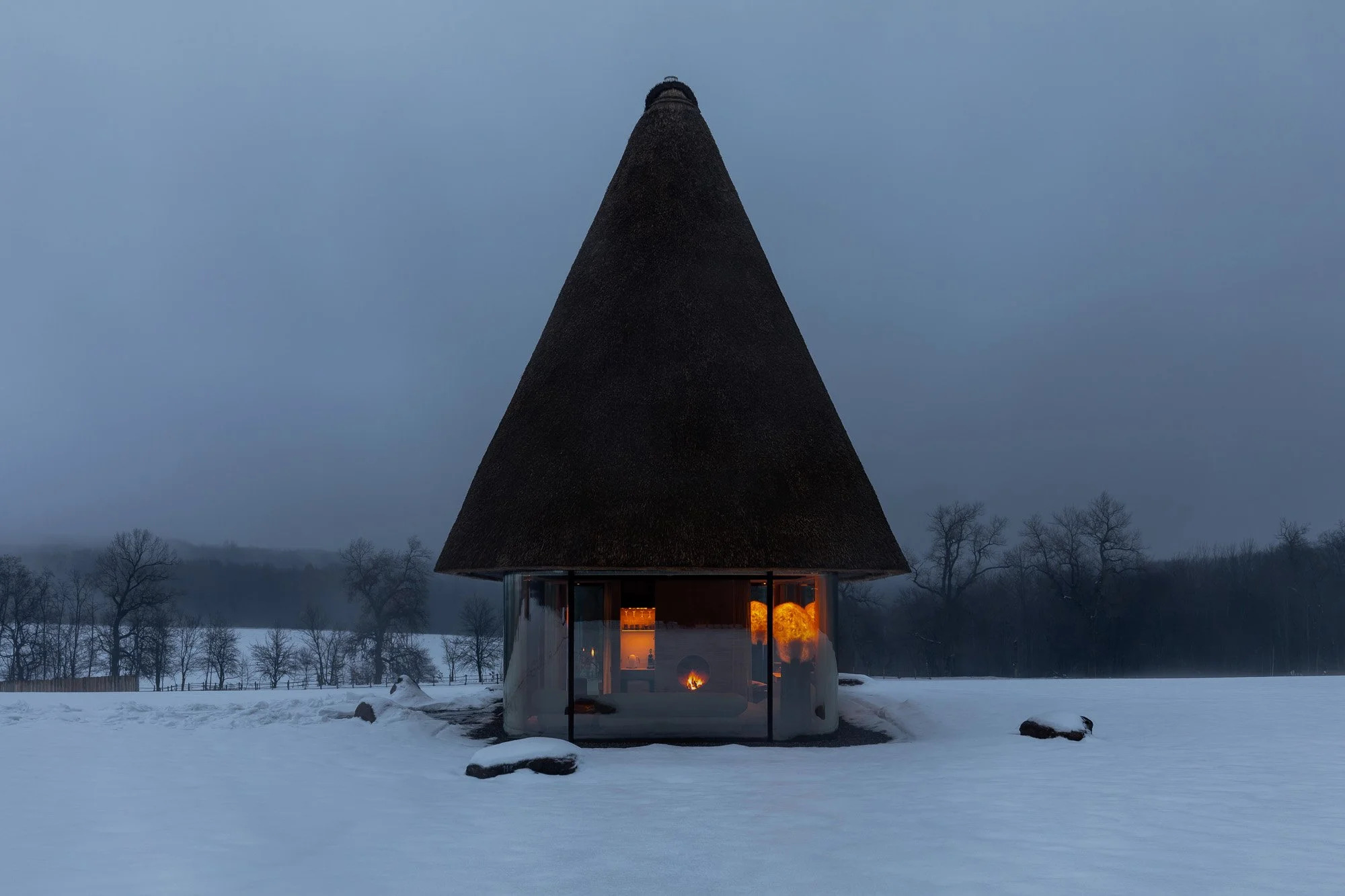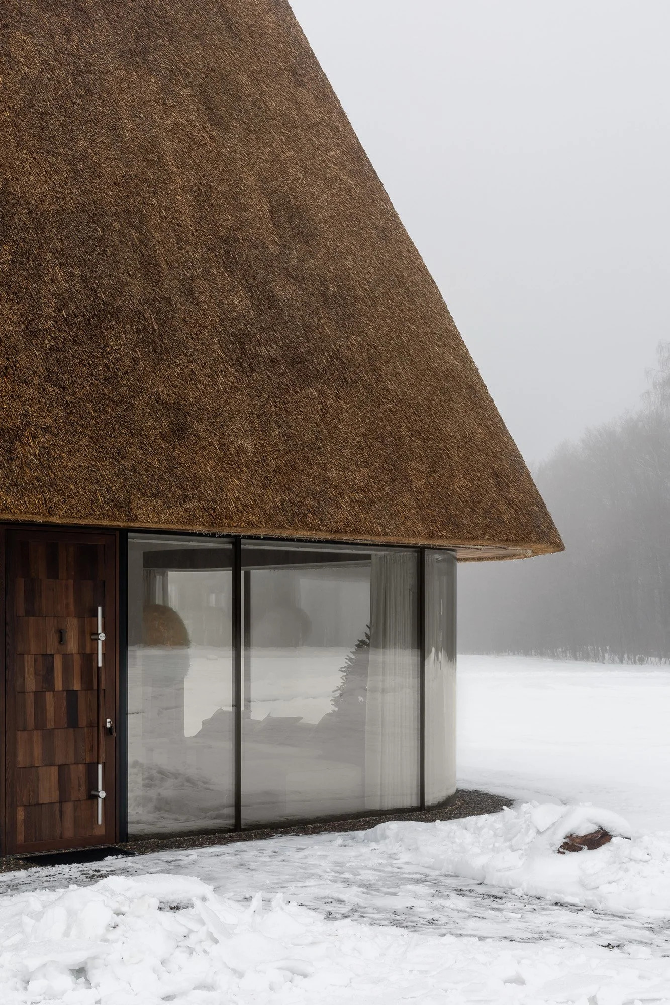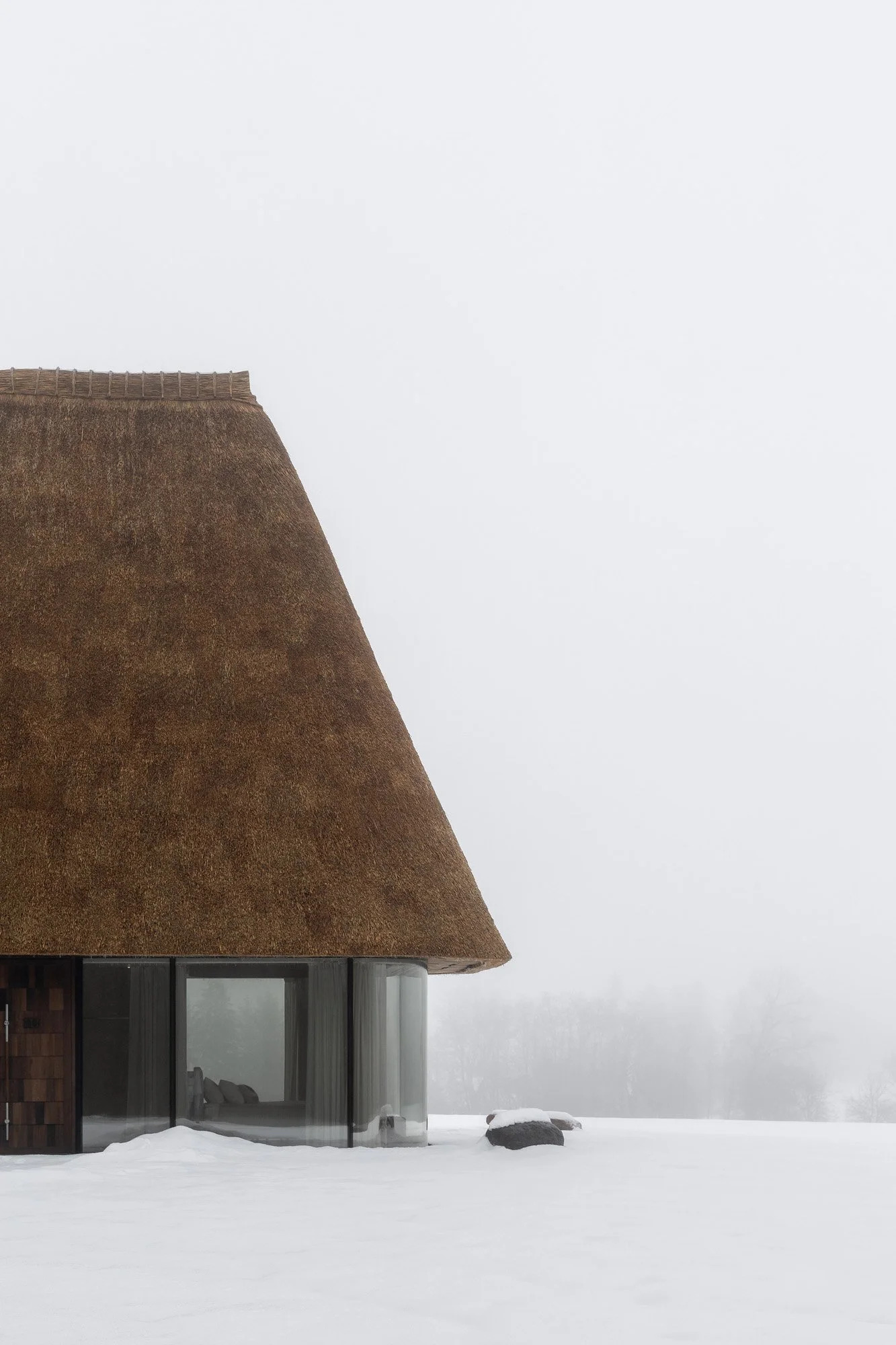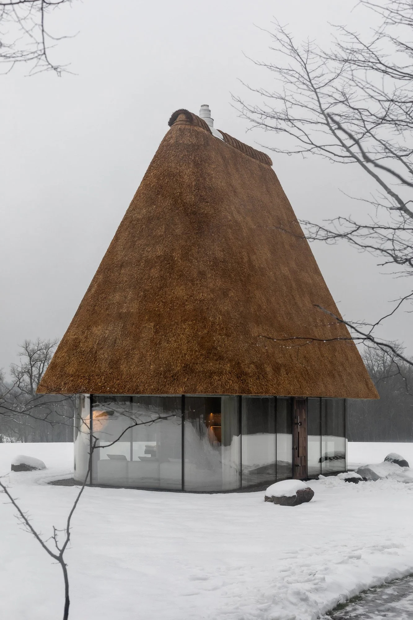In a rural area of central Ukraine, a small group of buildings rises with a silhouette that is at once solid and light, reminiscent of a traditional hat or a generously sized mushroom. These are the guest lodgings known as “Under the Reed Roof”, a project by the architecture studio YOD Group that draws on vernacular memory to quite literally build the house from the roof down.