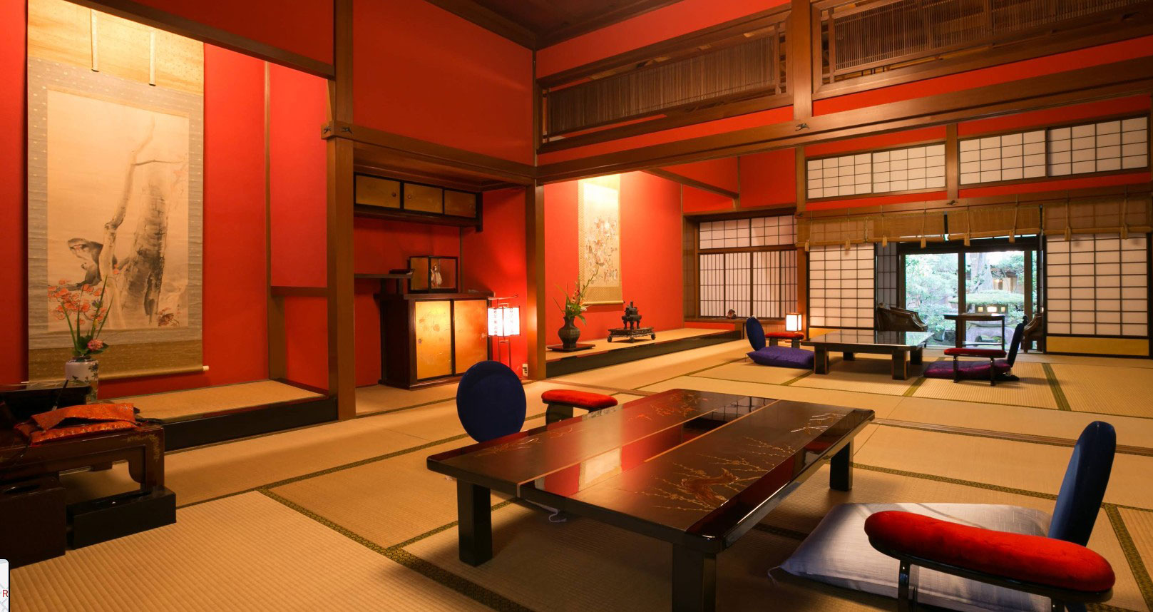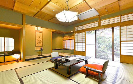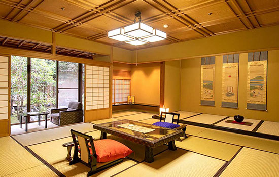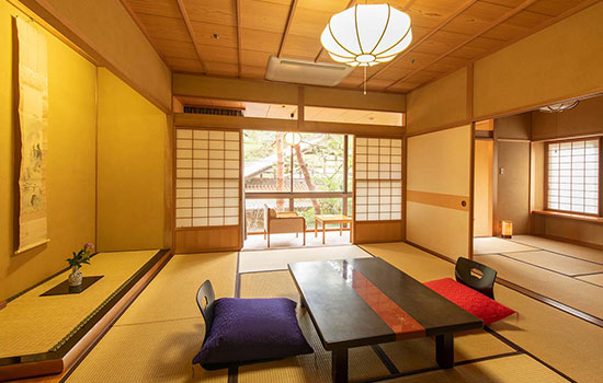 The rooms, with tatami flooring and futon bedding, maintain a sober yet refined aesthetic. Some offer direct views of the garden and private access to the hot spring baths; others, such as those in the Spring wing, are particularly sought after for their direct connection to the outdoors. In total, the ryokan has around one hundred rooms, with capacity for up to 450 guests.