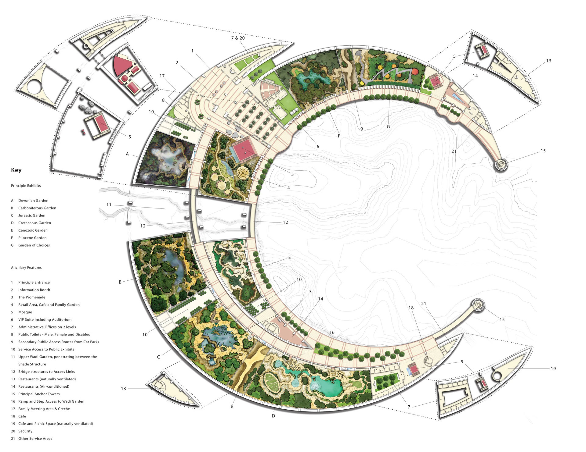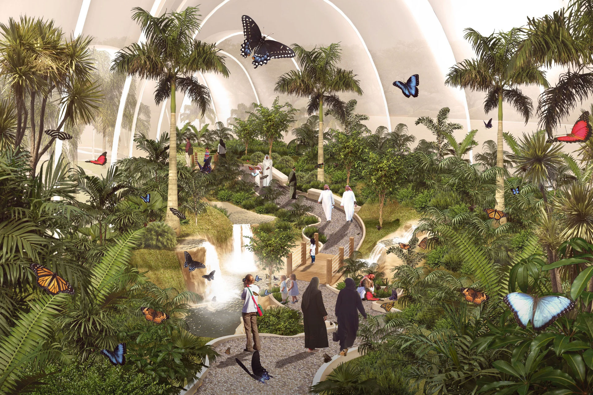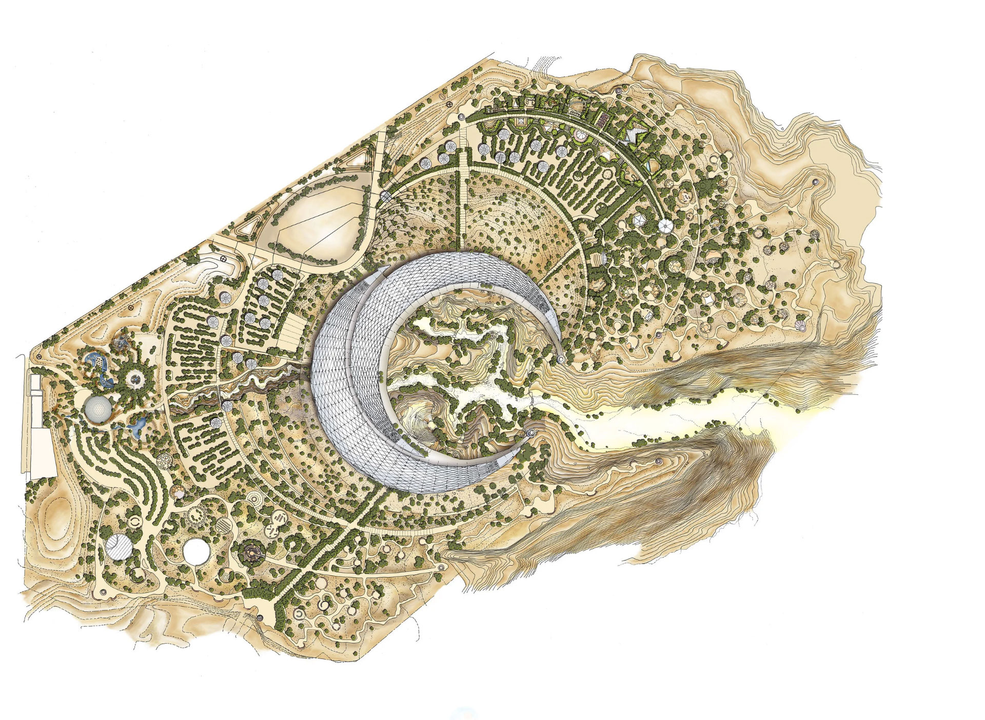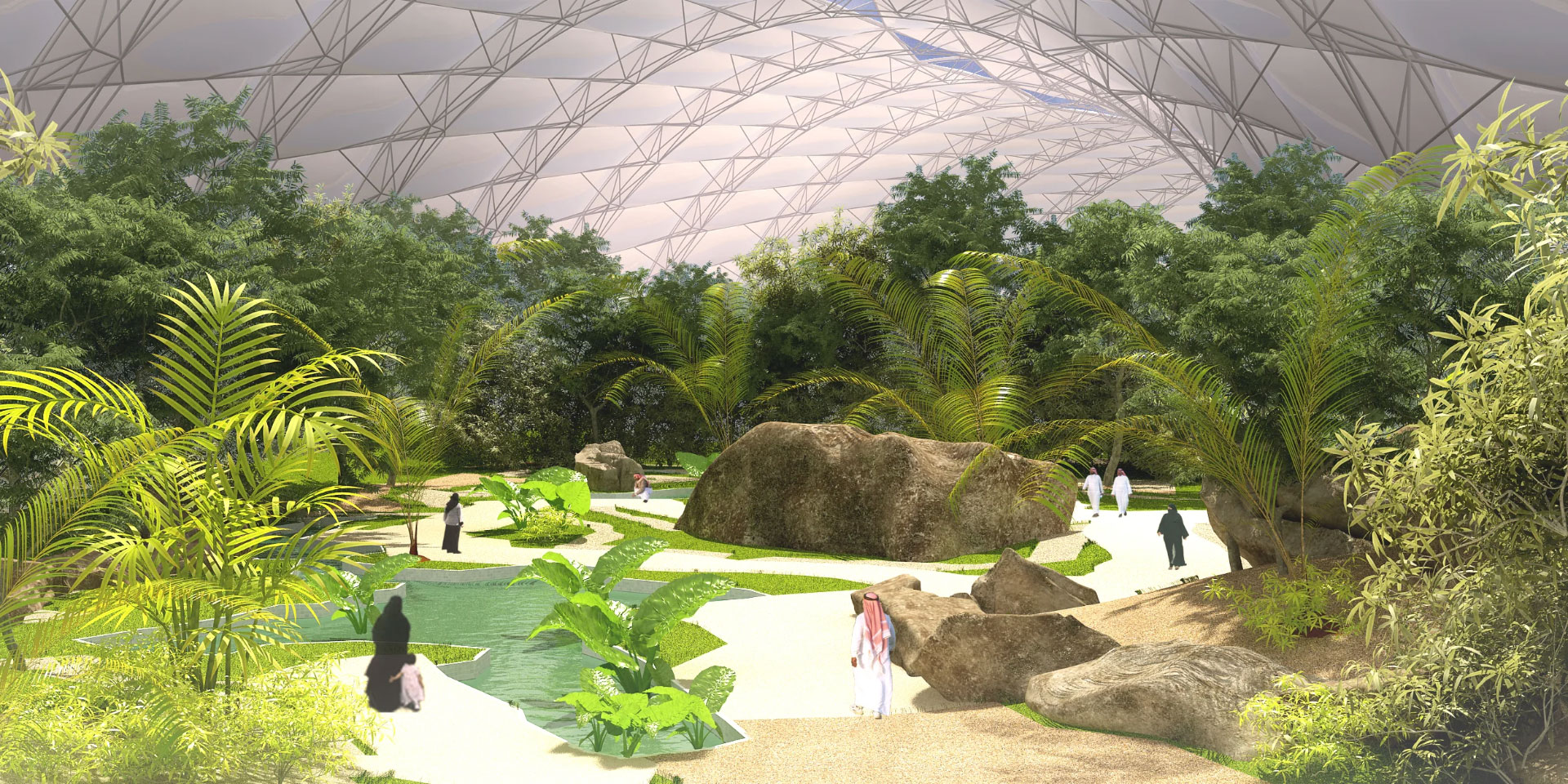 In terms of architecture, the project consists of two gigantic greenhouses in the shape of two intertwined crescents, with a combined surface area of 9 hectares, each of which will house a biome, in other words, an ecological community of characteristic vegetation and fauna, determined by climate and geography. However, climate and geography will not be the only determining factors in the King Abdullah International Gardens; time will also take on a special character in each biome as the common thread of the exhibition. Inside these crescents, the environmental conditions of different geological eras will be accurately recreated.