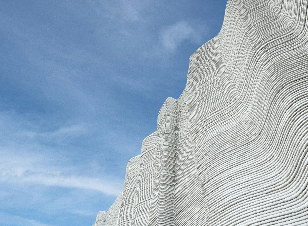 The architecture of the two-storey schools is inspired by the dunes of the Qatari desert. Their curved organic walls would be extremely costly—or simply unfeasible—to build using traditional construction methods. 3D printing allows for this formal freedom, with a drastic reduction in material consumption and waste production and, as is well known, CO₂ emissions.