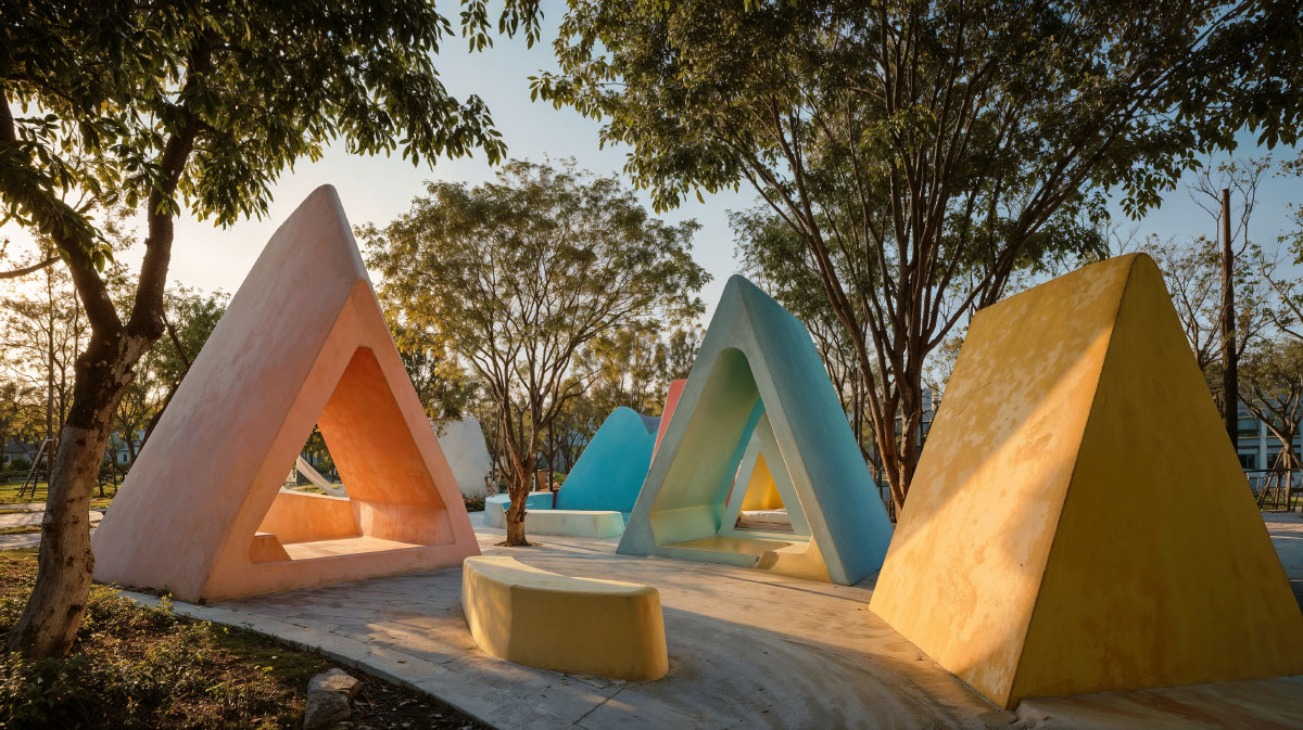 Soft yet cheerful colours identify each element of a playful, almost dreamlike landscape that stimulates the imagination while avoiding visual saturation, not only in the play area but also in the surrounding public park. The little houses offer shelter, shade and meeting points, open to both individual and group play.