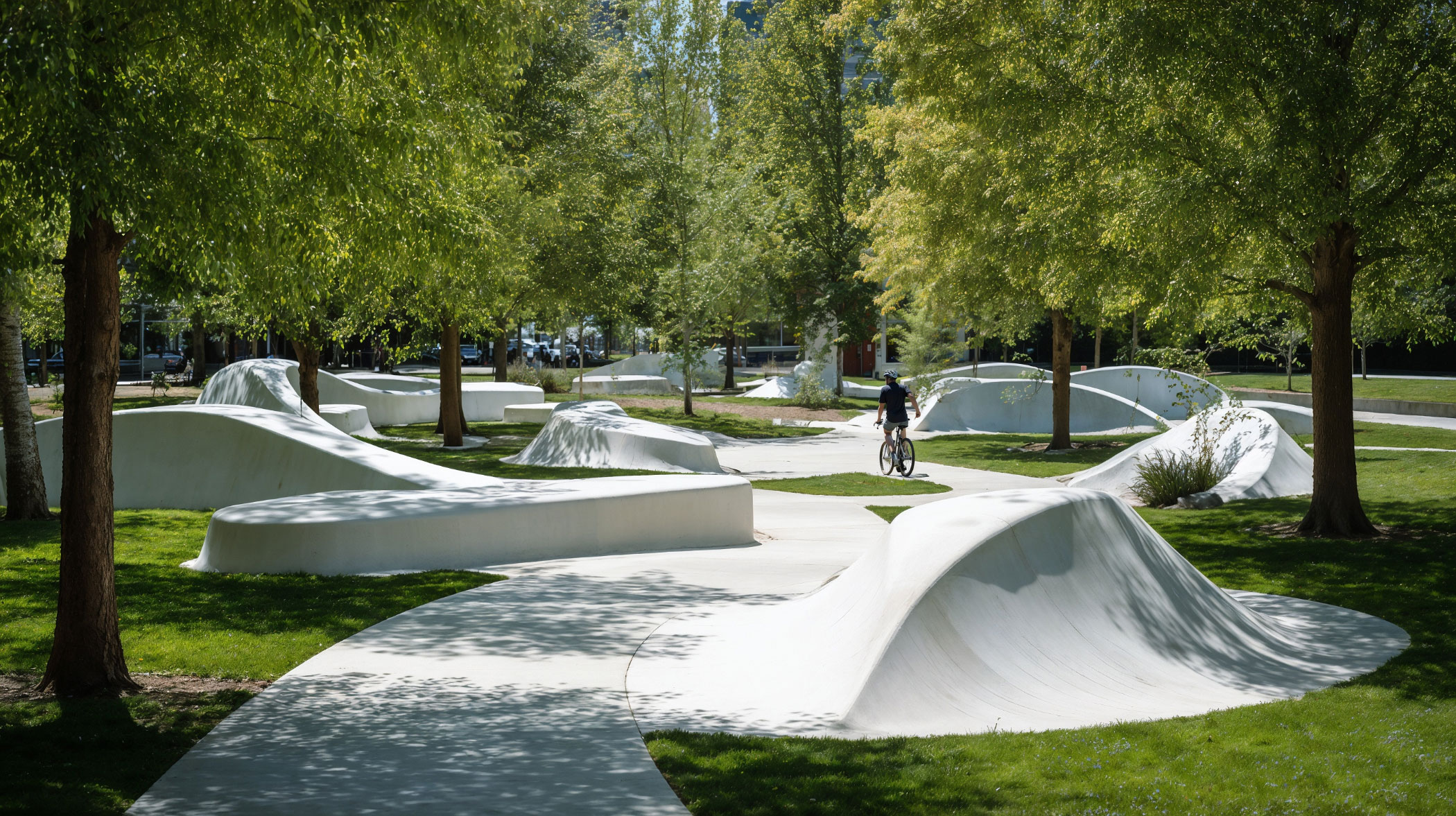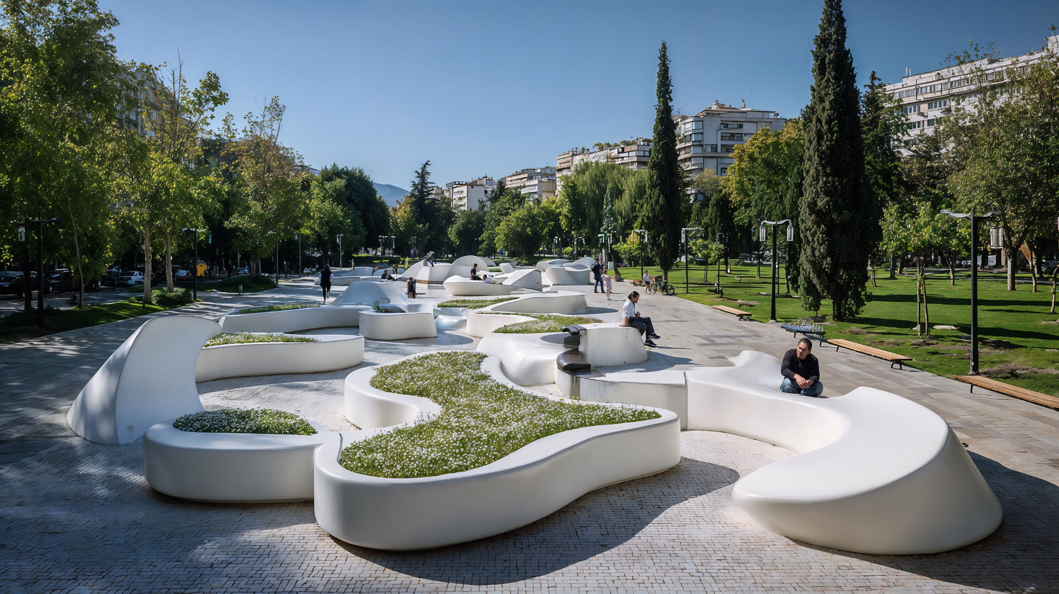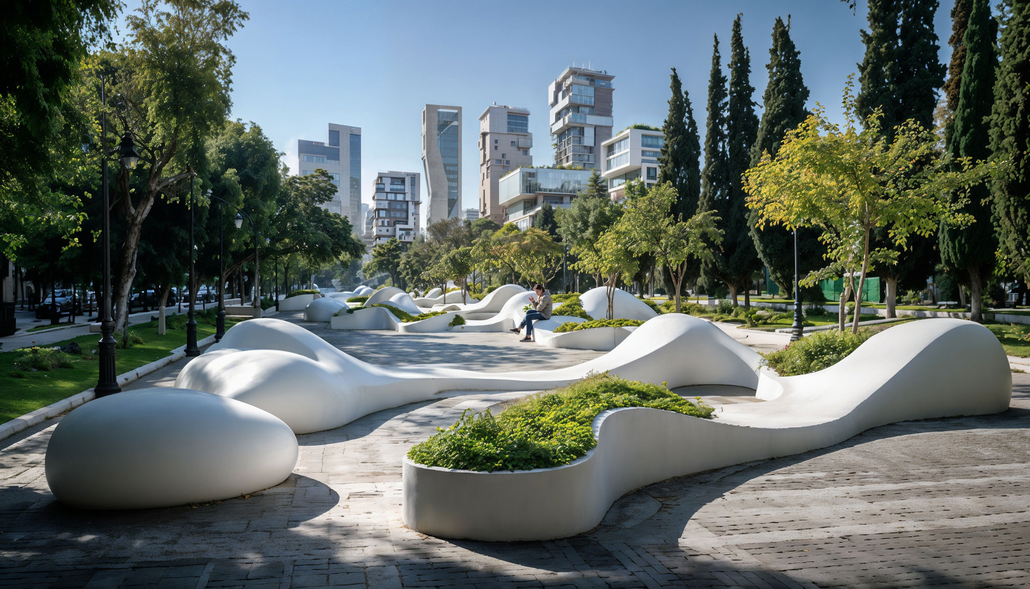 With this proposal, Amusement Logic’s Design Department turns public space into a kind of soft, fluid and continuous topography. The shapes extend, rise, fold and descend as if the terrain itself were stretching; as if it were breathing and inviting people to rest, stroll or play with its breaths; without hierarchies or defined limits. They are not benches, they are spaces that naturally welcome, almost with a caress, the gazes and bodies of passers-by.